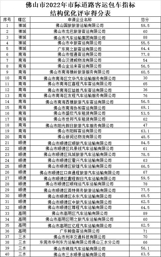 根据市政府关于促进经济平稳增长的工作要求,我局开展市际道路客运包车指标结构优化工作,并依据企业的诚信评价、安全生产、经营管理、应急服务、创新服务、社会责任和贡献等情况,对申请企业进行了综合评审。为确保本次市际包车指标结构优化工作公平、公正、公开,现将申请企业的评分结果进行公示,公示日期为2022年12月5日至2022年12月9日。公示期间如有异议,可通过书面、电子邮件的形式向我局反映。