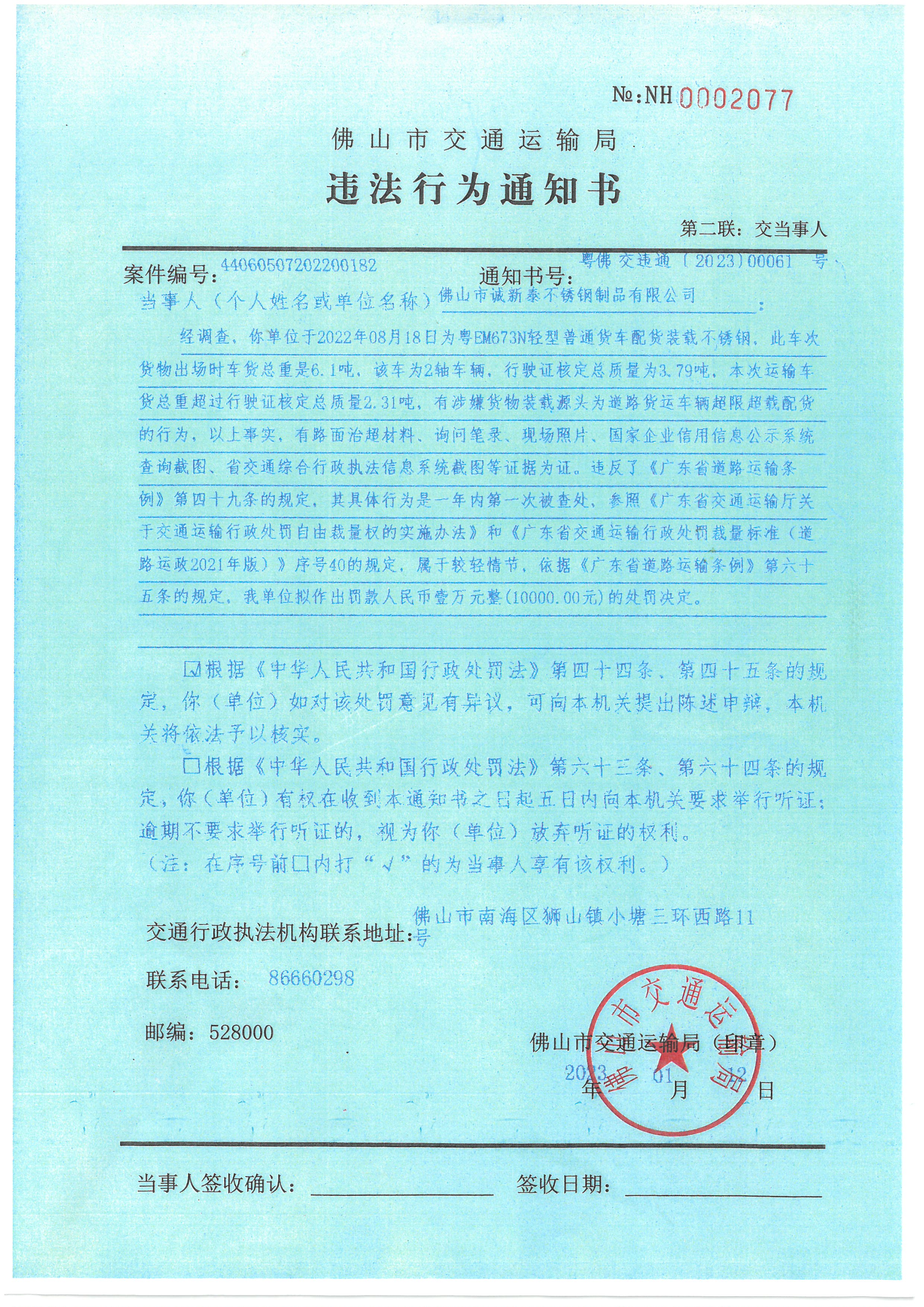 365BET体育下载_英国365客服_Best365官网登录诚新泰不锈钢制品有限公司: 因通过其它方式均无法送达《违法行为通知书》,依据《中华人民共和国民事诉讼法》第九十五条规定,现向你(单位)公告送达《违法行为通知书》,《违法行为通知书》文号:粤佛交违通[2023]00061号。自公告之日起,经过三十日即视为送达。违法行为通知书内容如下: 经调查,本机关认为你单位使用粤EM673N轻型普通货车于2022年08月18日有涉嫌货物装载源头为道路货运车辆超限超载配货的违法行为,以上事实,有路面治超材料、询问笔录、现场照片、国家企业信用信息公示系统查询截图、省交通综合行政执法信息系统截图等证据为证。违反了《广东省道路运输条例》第四十九条的规定,其具体行为是一年内第一次被查处,参照《广东省交通运输厅关于交通运输行政处罚自由裁量权的实施办法》和《广东省交通运输行政处罚裁量标准(道路运政2021年版)》序号40的规定,属于较轻情节,依据《广东省道路运输条例》第六十五条的规定,本机关拟作出罚款人民币壹万元整(10000.00元)的处罚决定。 根据《中华人民共和国行政处罚法》第四十四条、第四十五条的规定,你(单位)如对该处罚意见有异议,可向本机关提出陈述申辩,本机关将依法予以核实。 上述文书已张贴在我局南海综合执法支队(执法七大队)的办公地址(365BET体育下载_英国365客服_Best365官网登录南海区狮山镇小塘三环西路11号)门口公告栏,现在365BET体育下载_英国365客服_Best365官网登录交通运输局网站上同时发布公告信息。 附件:《违法行为通知书》(365BET体育下载_英国365客服_Best365官网登录诚新泰不锈钢制品有限公司,粤佛交违通[2023]00061号).jpg