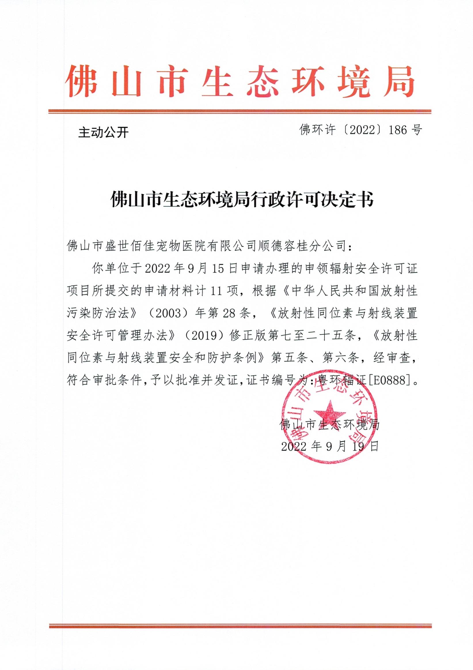 附件下载:佛环许〔2022〕186号365BET体育下载_英国365客服_Best365官网登录盛世佰佳宠物医院有限公司顺德容桂分公司.jpg