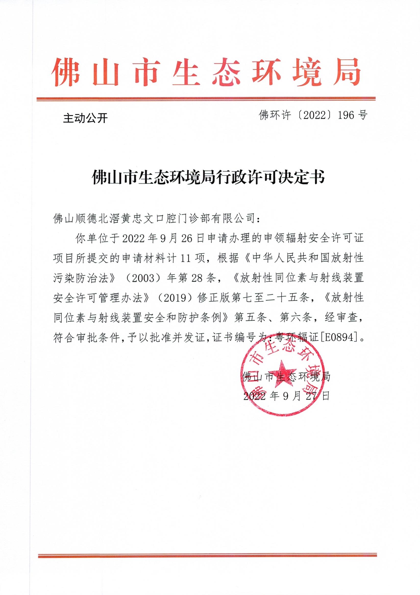 附件下载:佛环许〔2022〕196号佛山顺德北滘黄忠文口腔门诊部有限公司.jpg
