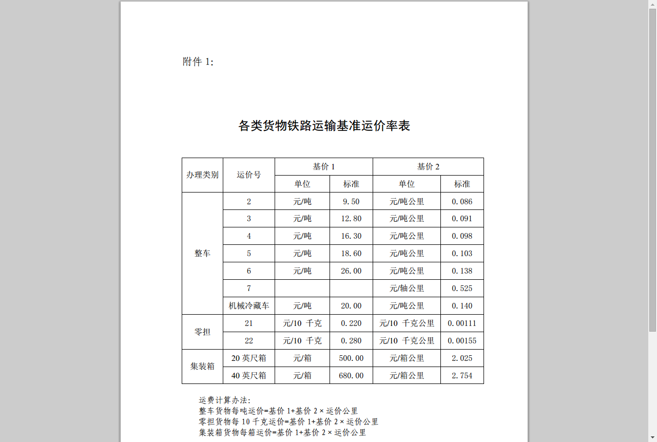 附件:1、各类货物铁路运输基准运价率表