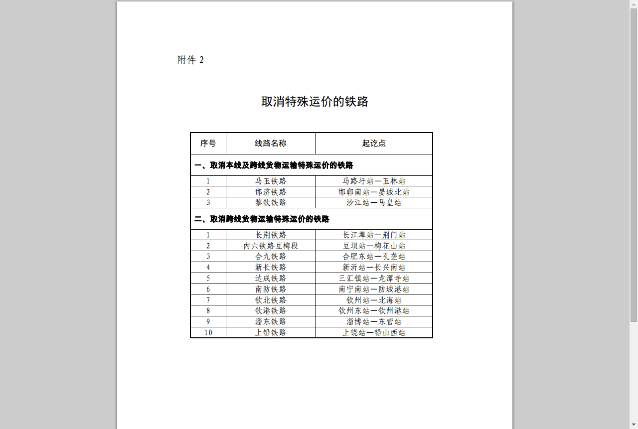2、取消特殊运价的铁路