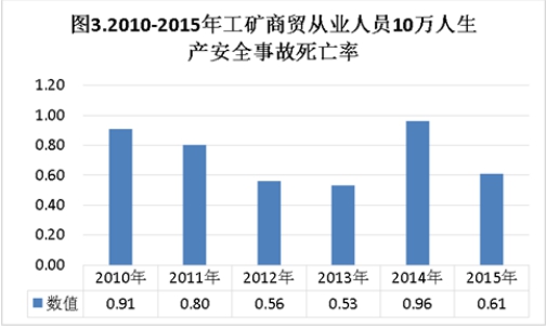 4.工矿商贸企业从业人员10万人生产安全事故死亡率控制平稳。“十二五”期间我市工矿商贸企业数量、从业人员小幅度平稳上升,而生产安全事故控制平稳。工矿商贸从业人员10万人生产安全事故死亡率2010—2013年呈平稳下降趋势。由于2014年发生一次死亡18人的顺德区“12·31”重大爆炸事故,2014年度工矿商贸事故死亡人数与2013年有大幅度增长,2014年度工矿商贸10万人死亡率出现反弹。2015年与2010年相比,工矿商贸从业人员10万人生产安全事故死亡率下降32.96%。